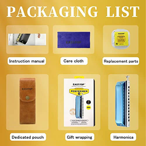 - Een nieuwe standaard in vakmanschap en bespeelbaarheid - De Performer is EASTTOP's professionele solo gestemde chromatische mondharmonica met een bereik van 3 octaven. De fosforbronzen rieten van de chromatische mondharmonica zijn geprofileerd voor toonaangevende respons en duurzaamheid. Speciale lucht besparende ventielen en het ABS kam-ontwerp garanderen toonaangevende respons en geluidsprojectie over het gehele bereik.