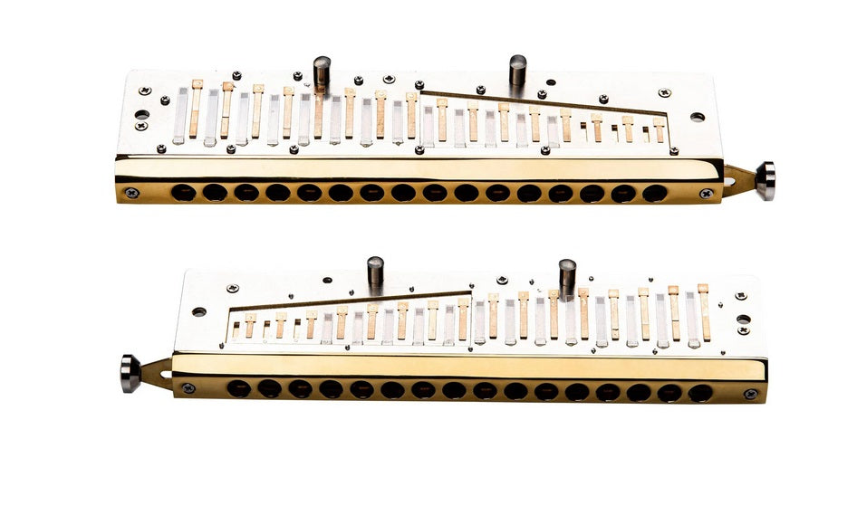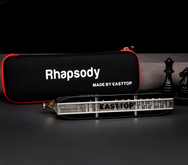 Dit is de Rhapsody! Een 16-gaats chromatische mondharmonica gebaseerd op de EAP-16 serie maar dan in een speciale uitvoering. Het mondstuk ligt lekker in de mond door de halfronde vormgeving, welke overigens een gold-look afwerking heeft, dit te samen met de zwarte afdekplaten maakt deze mondharmonica een plaatje om te zien. Dit is een professionele mondharmonica met in totaal 64 tonen, de schuif werkt vloeiend zonder bij geluiden, de harmonica speelt soepel en snel door de verfijnde riet technologie van Easttop met fosfor-bronzen rieten. Geleverd in een bij passende hoogwaardige case met rits sluiting, wat deze set compleet maakt voor de gebruiker!