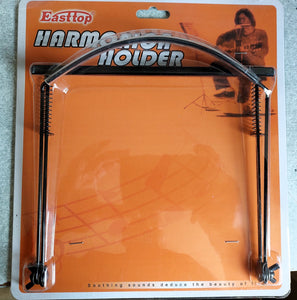 Zwart van kleur, werkt met een veer systeem waar de mondharmonica mee vast geklemd wordt.