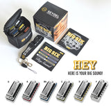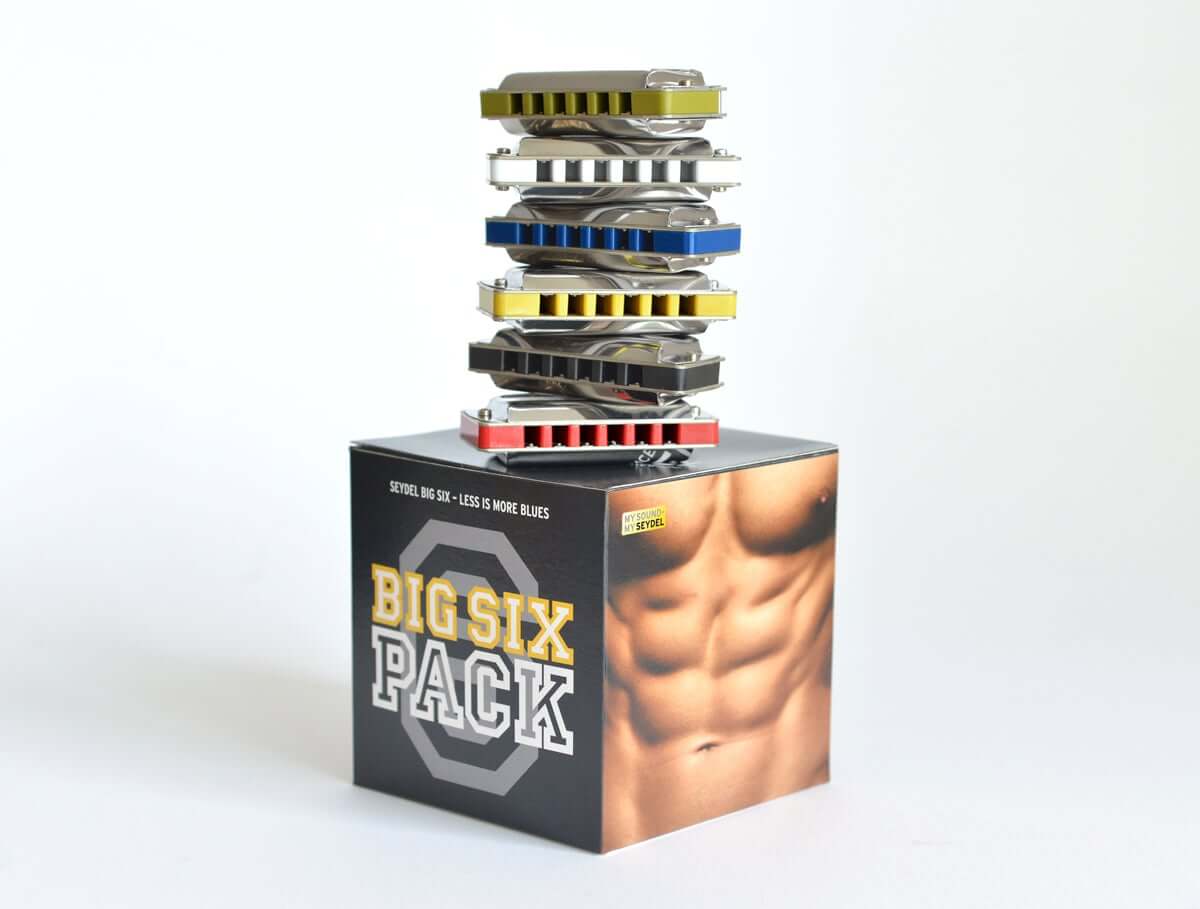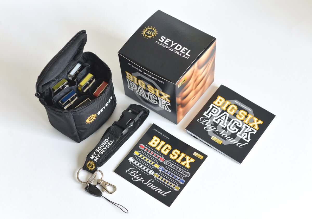 De originele SEYDEL-Sixpack met zes Big-Six-mondharmonica's voor de prijs van vier! De handige heuptas en een praktische SEYDEL sleutelkoord worden gratis bij geleverd.